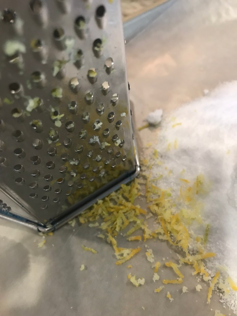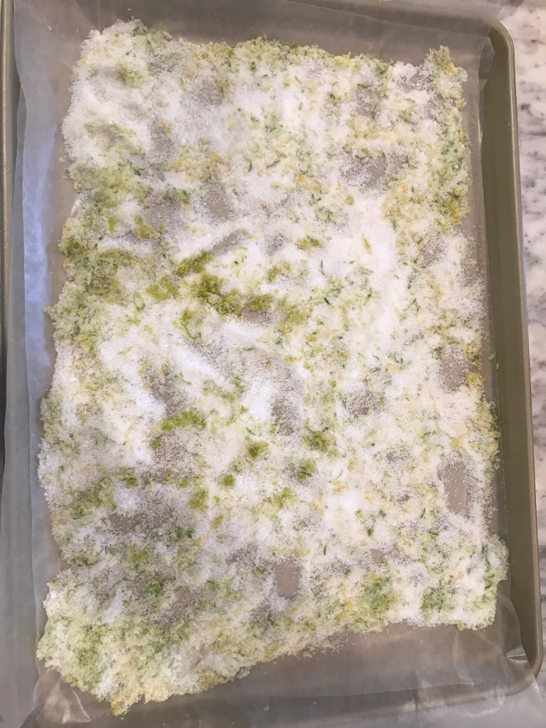 Wait! Save a few lemons to make lemon salt. Preheat the oven to 300 degrees. Zest a couple of lemons. I also had an orange and a lime laying around, so I zested those as well.
