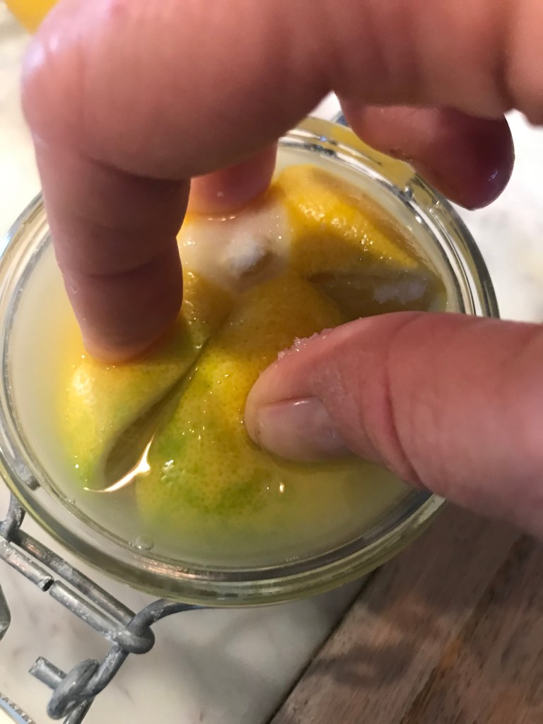 You don’t need to go the bottom for this recipe — it’s that easy. You need lemons, salt and jars. Kosher salt works best. If you have a lemon tree, harvest them when they are nice and yellow – normally in January in Florida. Otherwise, head to Costco and buy a couple of bags.