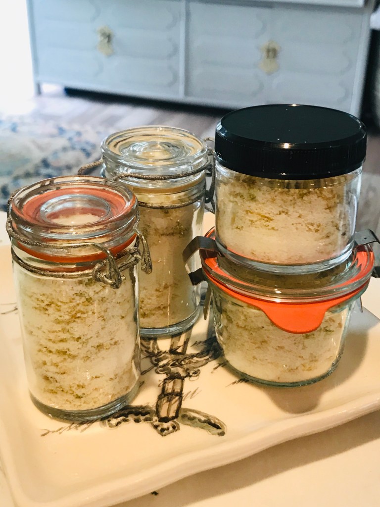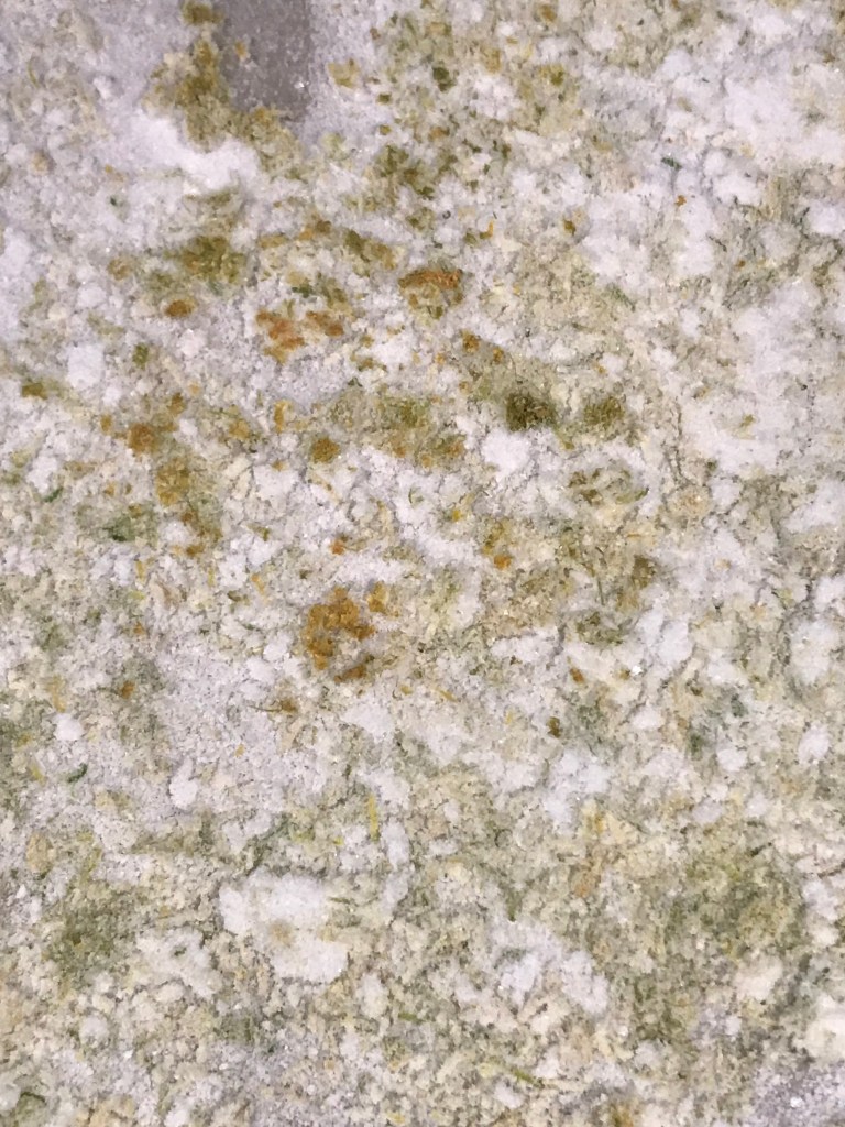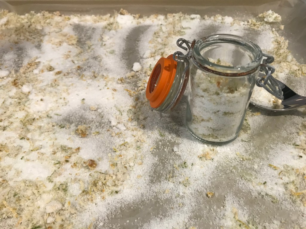Remove the cookie sheet and fill your little jars with the lemon salt. Done. The Girl and the Fig, a restaurant in Sonoma, Calif., sells this salt for $10 for a little jar: click here. You just made it at home for about 8 cents, if you don’t include the jar. You can use this citrusy salt for just about anything.